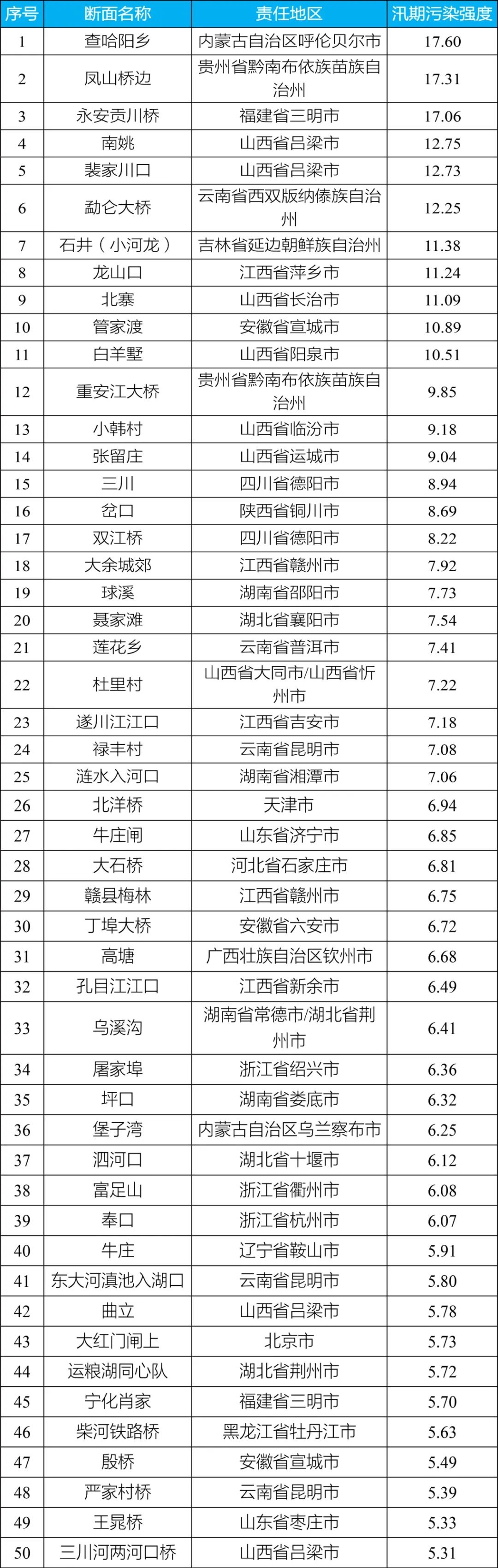全國汛期污染強度較大的前50名斷面分布在20個省份(見附件3),數量較多省份為山西(9個)、江西(5個)、云南(5個)。其中,內蒙古自治區呼倫貝爾市查哈陽鄉斷面、貴州省黔南布依族苗族自治州鳳山橋邊斷面、福建省三明市永安貢川橋斷面汛期污染強度位于全國前三名,分別達到考核目標限值的17.6倍、17.3倍、17.1倍。