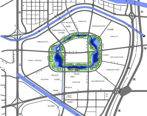 鄭州市鄭東新區位于鄭州市東部,北臨連霍高速公路,東臨京珠高速公路,北部有賈魯河和黃河,西南有七里河。龍子湖工程是鄭東新區生態水系工程的一個重要組成部分,位于魏河以南、東風渠以北、107國道以東、京珠高速公路以西,西距龍湖約3km。龍子湖工程位于龍湖工程的下游,利用龍湖的下泄水進行水量補充和水體置換,構成鄭東新區完整的生態水系。